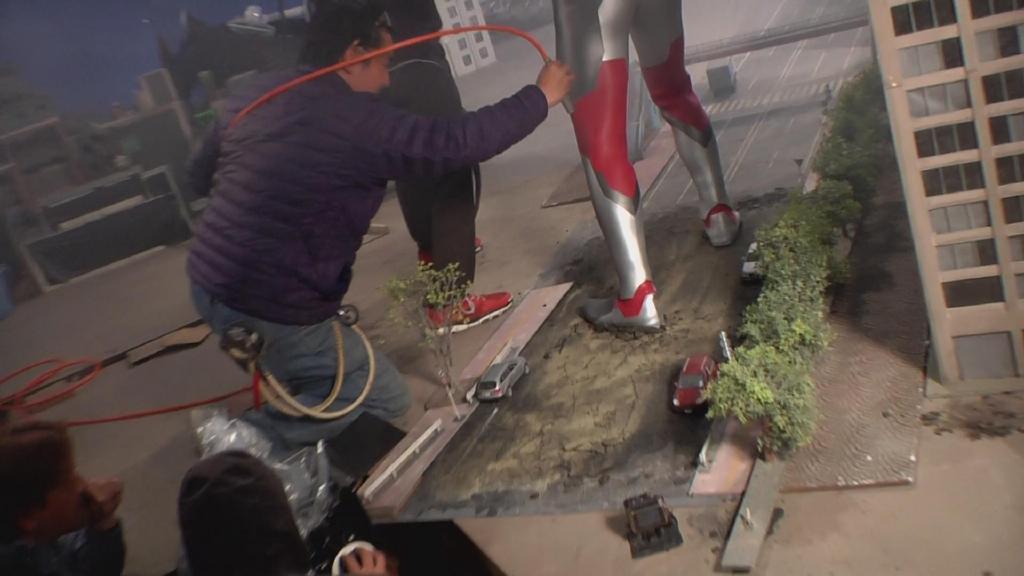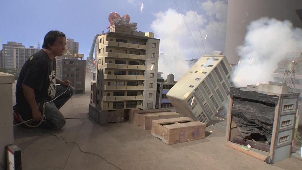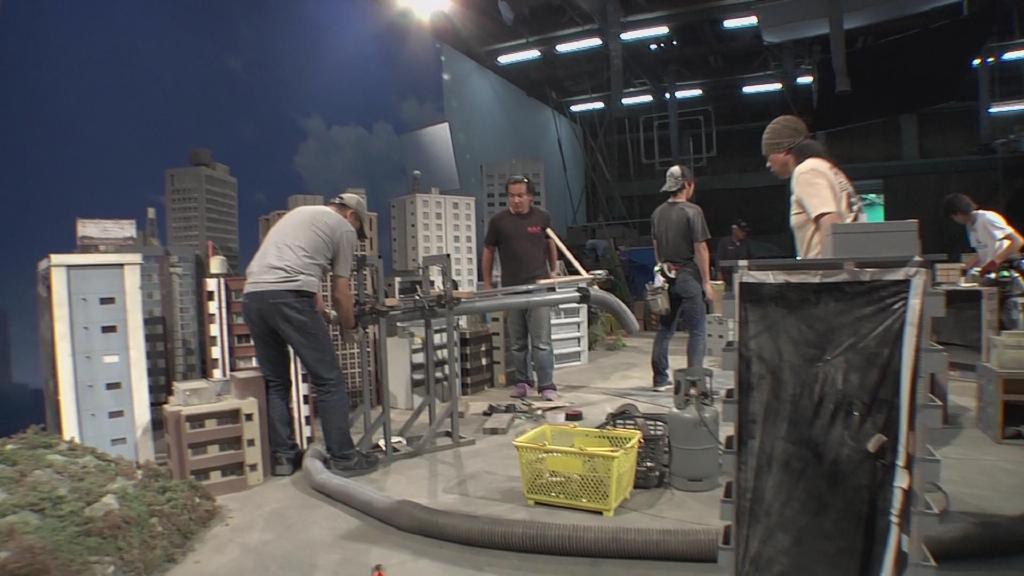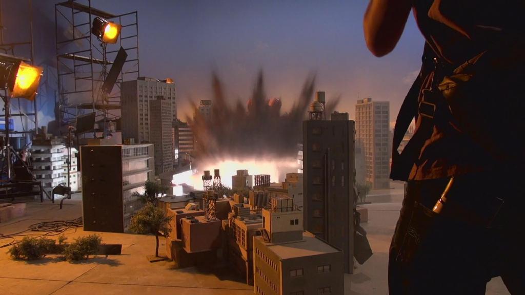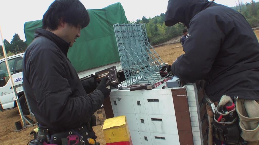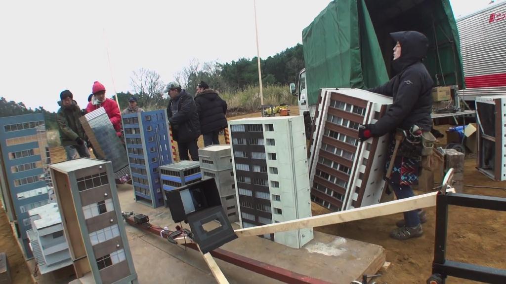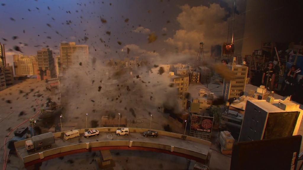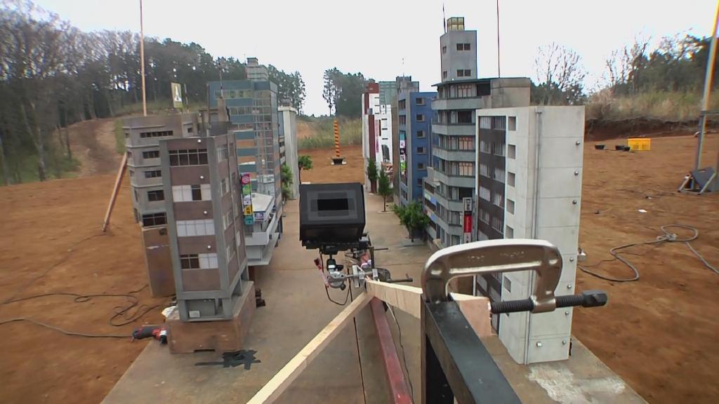首先是第一集迪玛加在城市里行走破坏街道的镜头:在户外摆好街道楼房的迷你模型,在楼房的外侧装好炸药,楼房的内侧安置好支架,在支架的前端安装好微型超广角摄像机,调整好仰角。