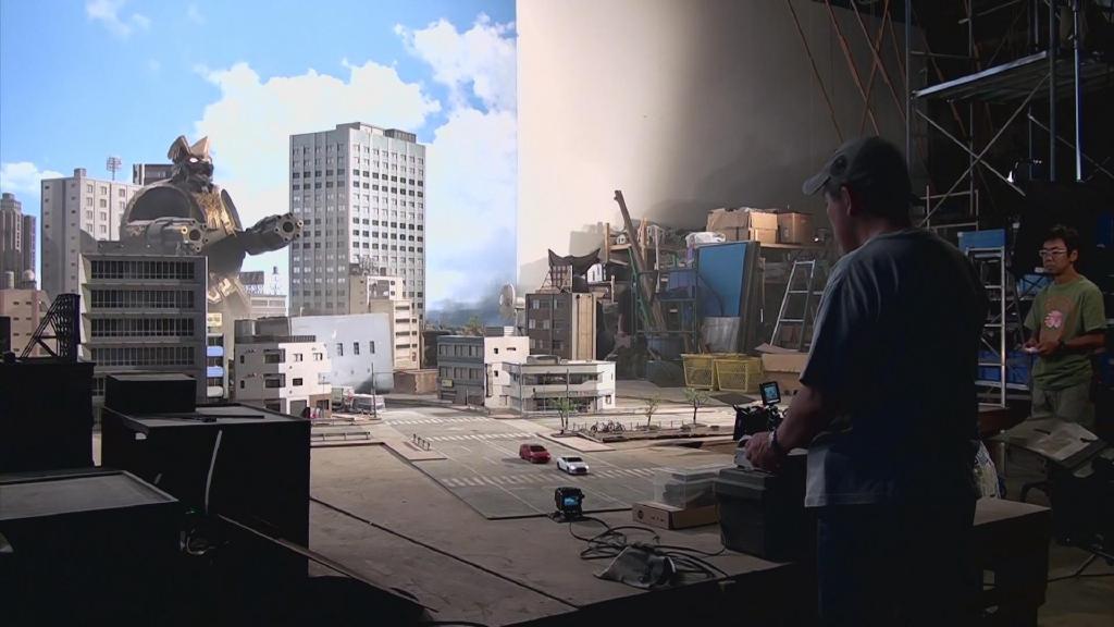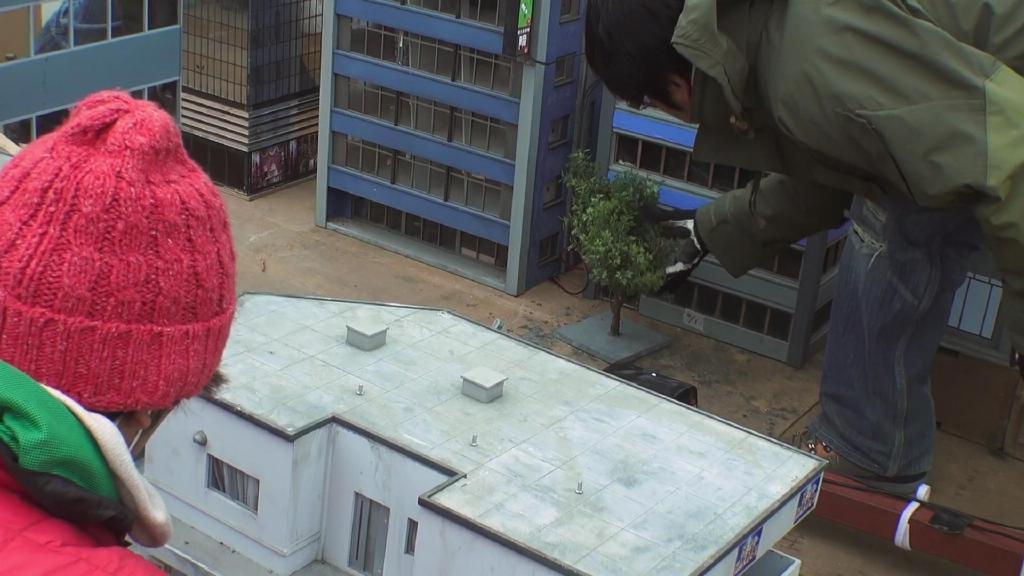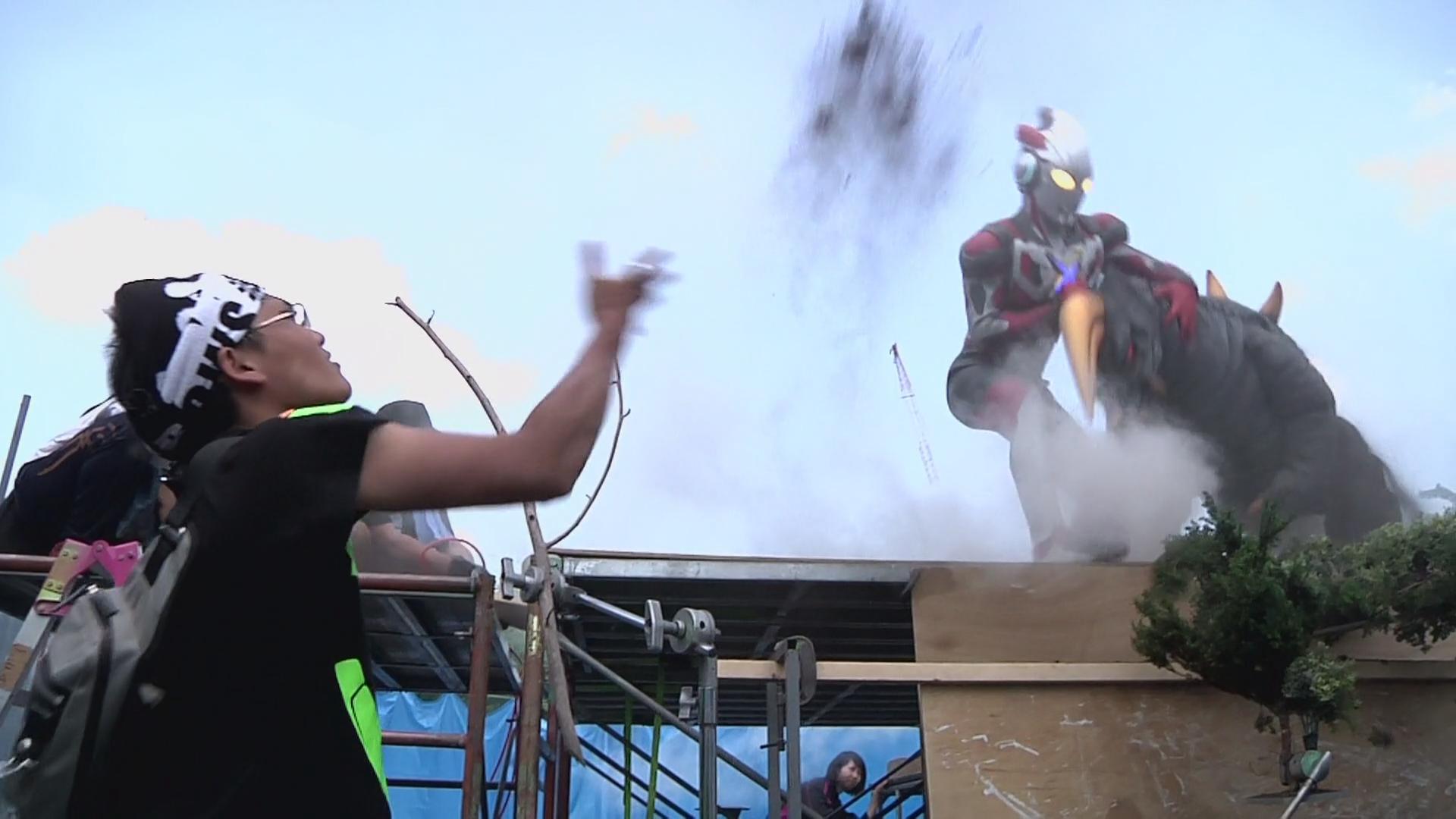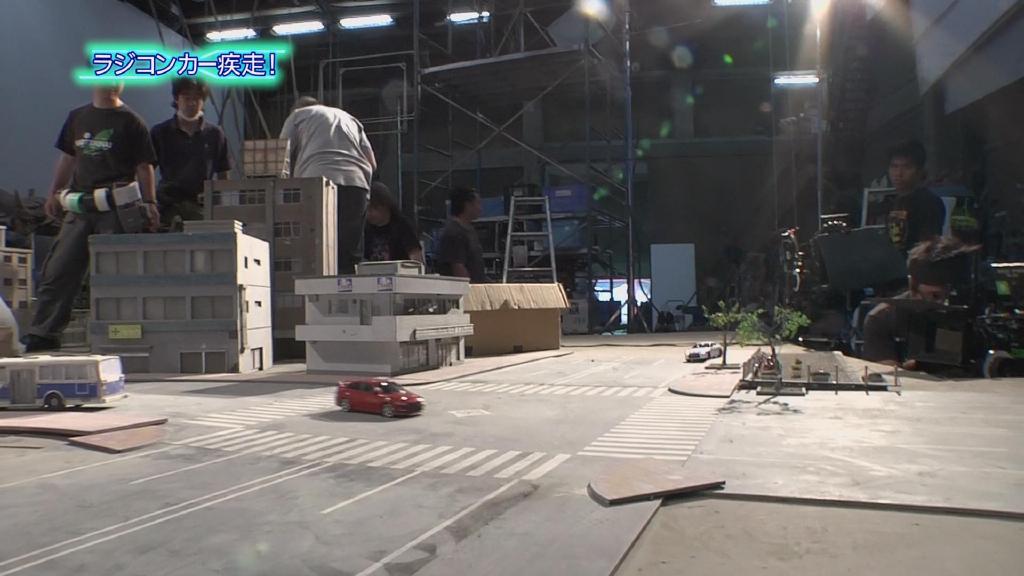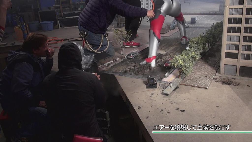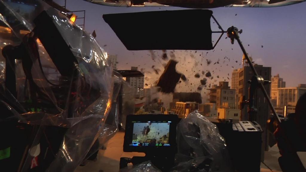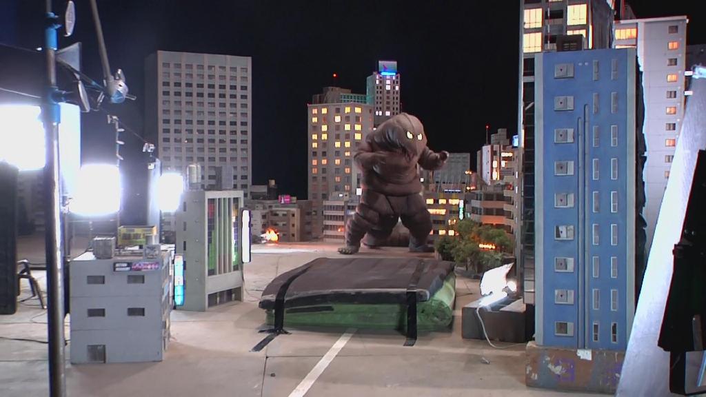首先是第一集迪玛加在城市里行走破坏街道的镜头:在户外摆好街道楼房的迷你模型,在楼房的外侧装好炸药,楼房的内侧安置好支架,在支架的前端安装好微型超广角摄像机,调整好仰角。