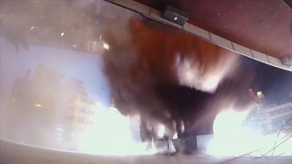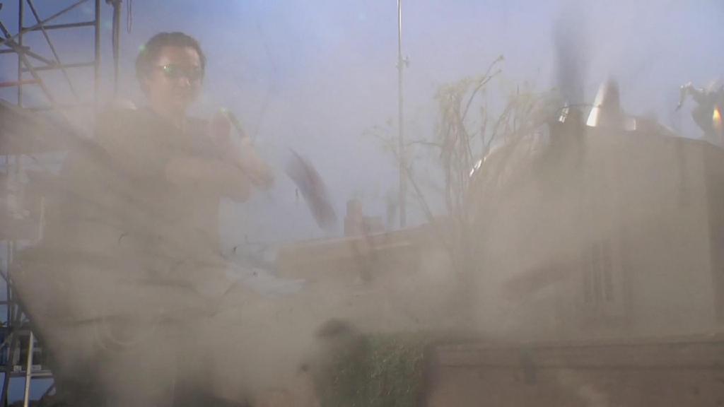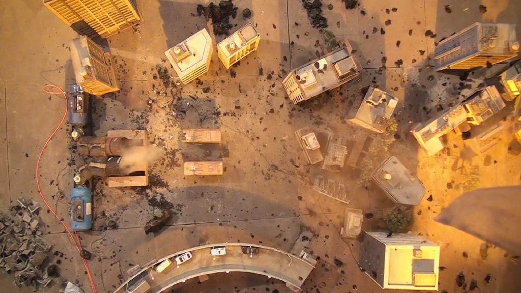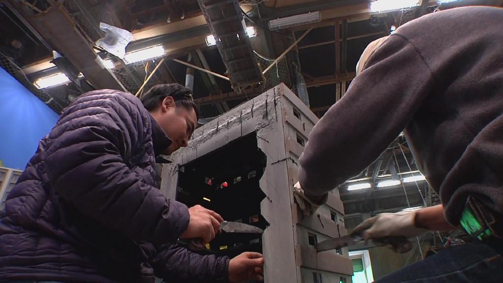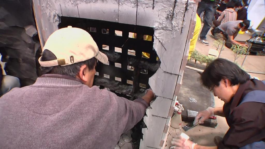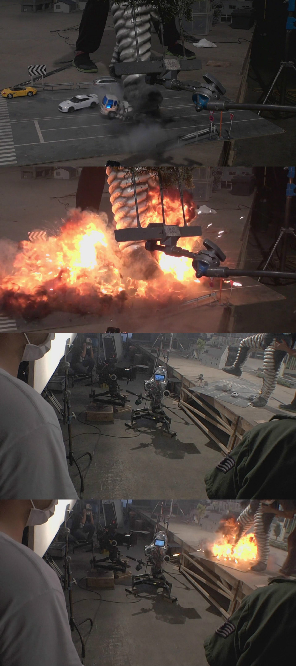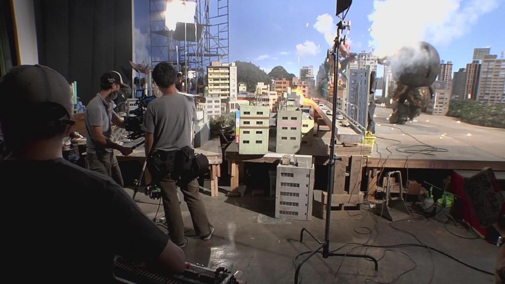 首先是第一集迪玛加在城市里行走破坏街道的镜头:在户外摆好街道楼房的迷你模型,在楼房的外侧装好炸药,楼房的内侧安置好支架,在支架的前端安装好微型超广角摄像机,调整好仰角。