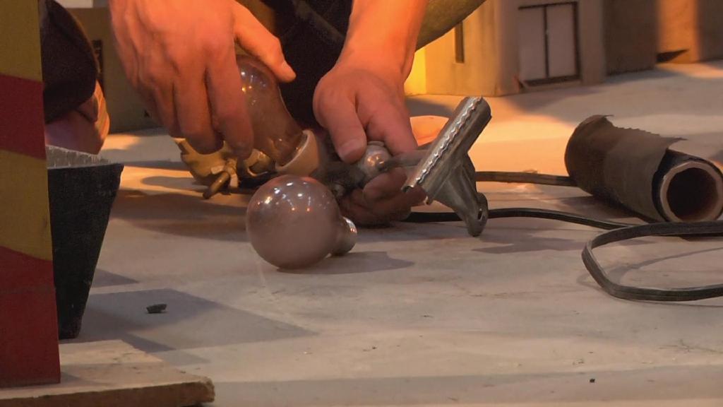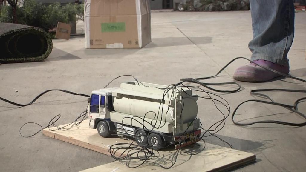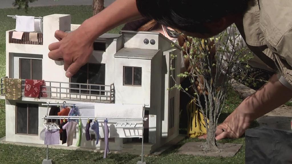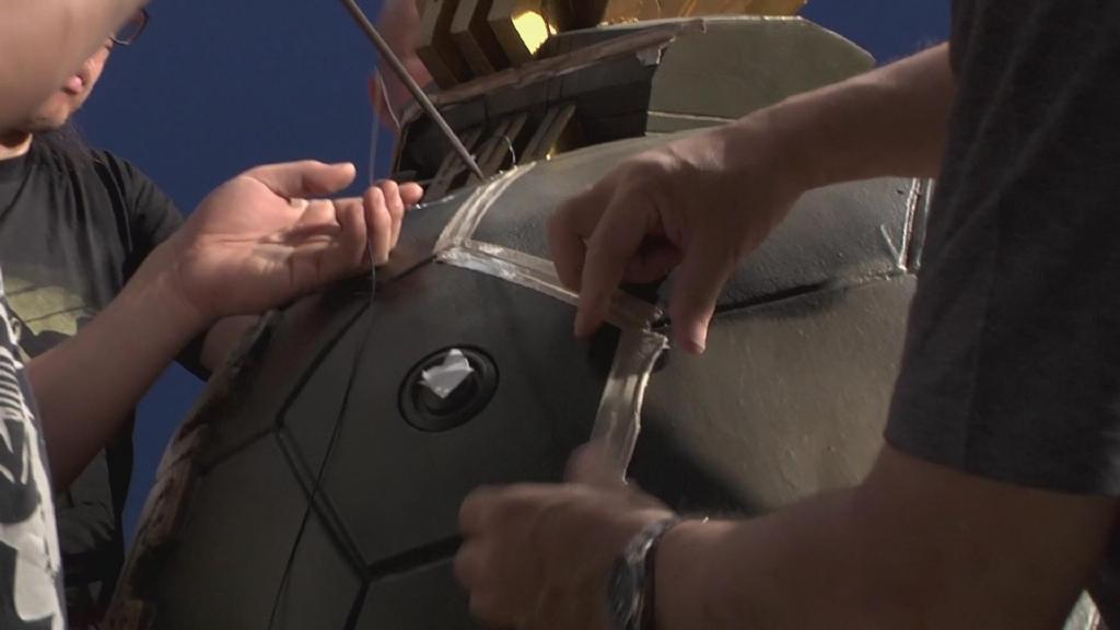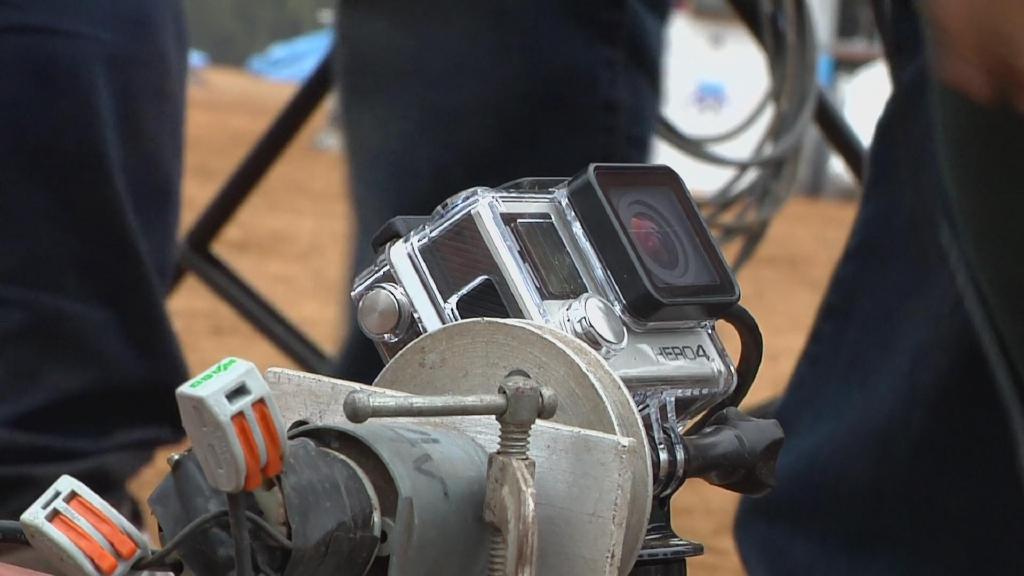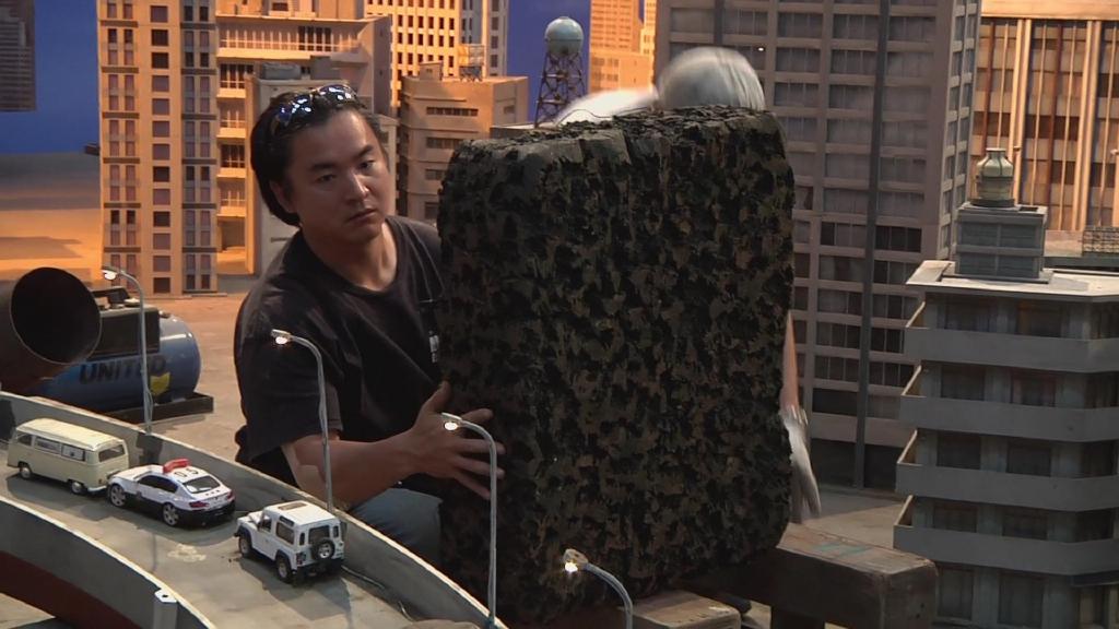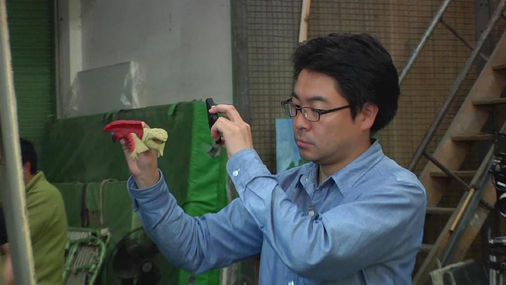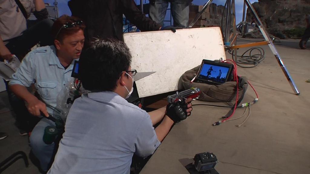 摄像高桥创拿起小型超广角摄像机对吊着的巴顿模型进行穿越式拍摄,该摄像机的优点在于可以以小物体的视角拍出巨大的广角。