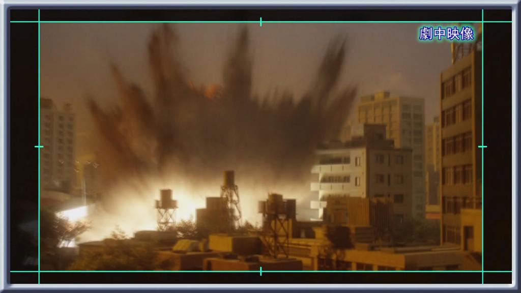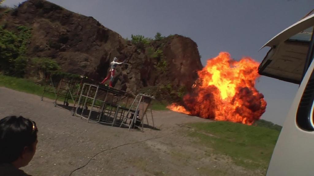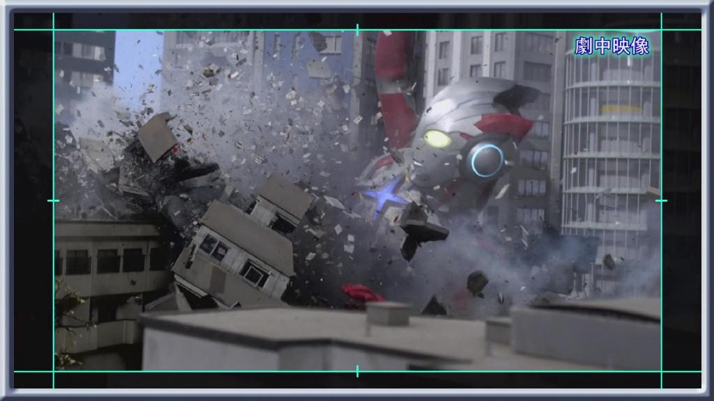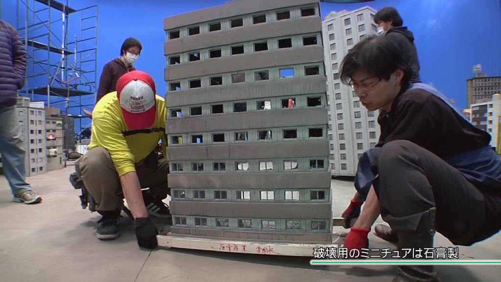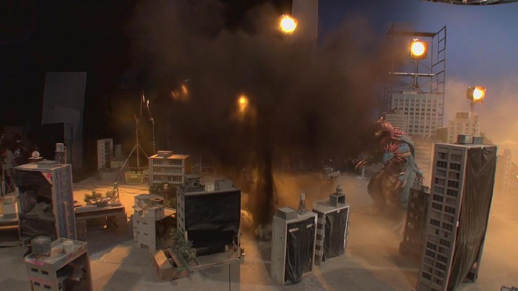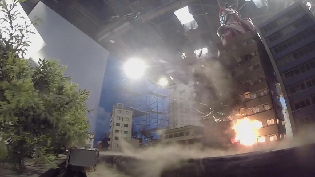 接着是第一话艾克斯被迪玛加的光线打中后倒下压倒房子的镜头:首先就是很传统的炸房子手法。即将爆破的大楼用石膏制作,为了方便爆破炸碎会事先切割开来,然后在内部埋设火药。