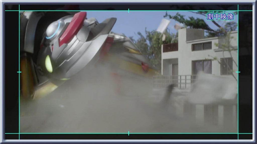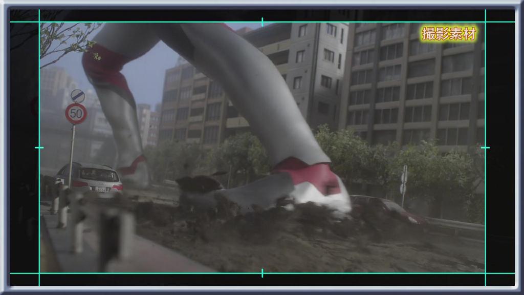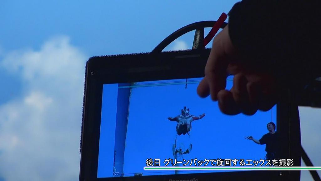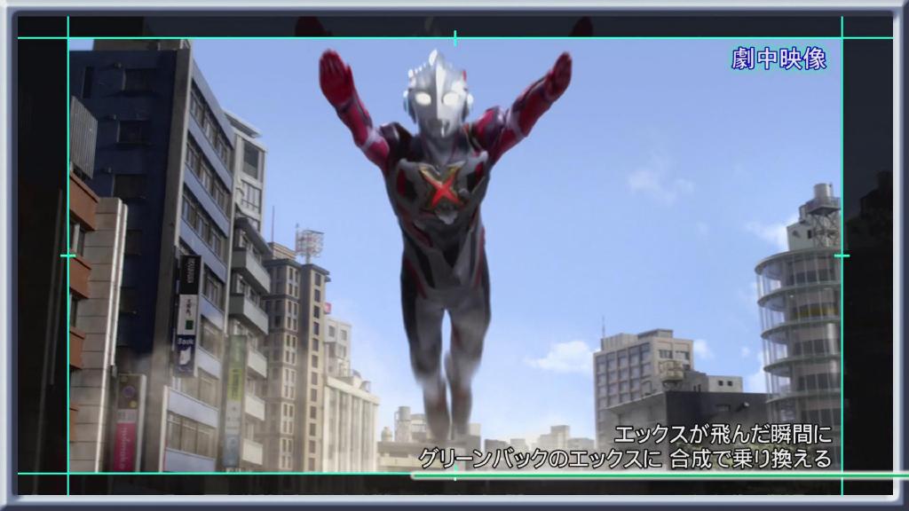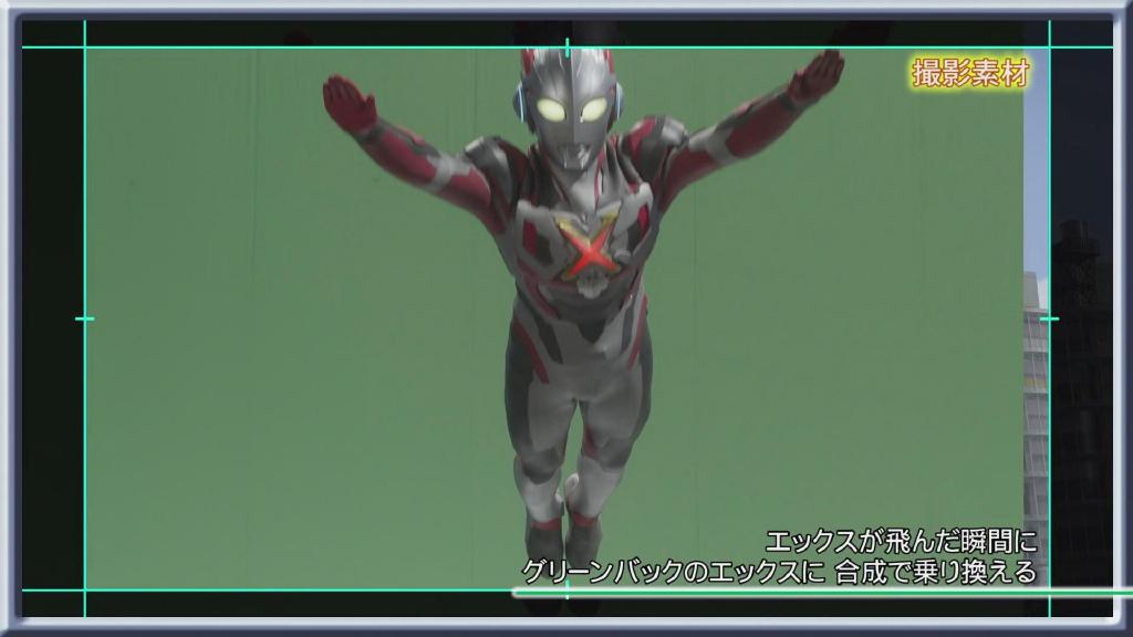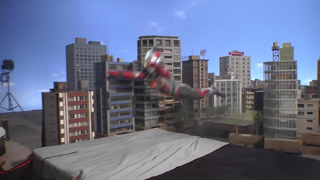 第一话艾克斯飞走的画面:依旧是结合现场扑街与绿幕飞走合成。